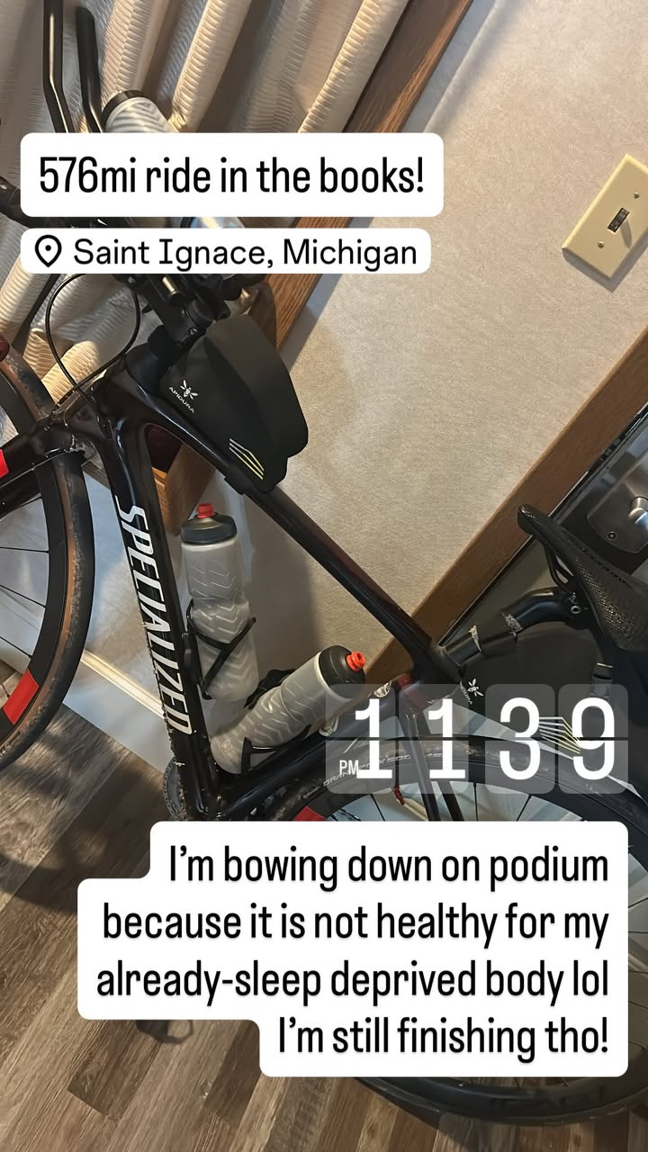 My race strategy split the route into two halves: ride to St. Ignace, sleep, ride back to Chicago. The plan held together reasonably well—right up until sleep deprivation introduced variables my simulator hadn't modeled. That was around mile 340, hour 23.